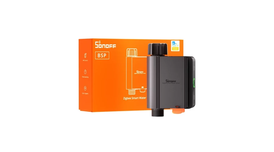 A Sonoff okos vízszelep egy okos Zigbee 3.0 megoldás az öntözésvezérléshez (IP55 kültéri víz- és porállósággal). Az elemmel működő eszköz támogatja mind az időzített ON/OFF, mind a vízmennyiség alapú ON/OFF üzemmódokat. Az okosvezérléshez és integrációhoz eWeLink vagy más kompatibilis Zigbee 3.0 átjáróhoz kell csatlakoztatni. | |